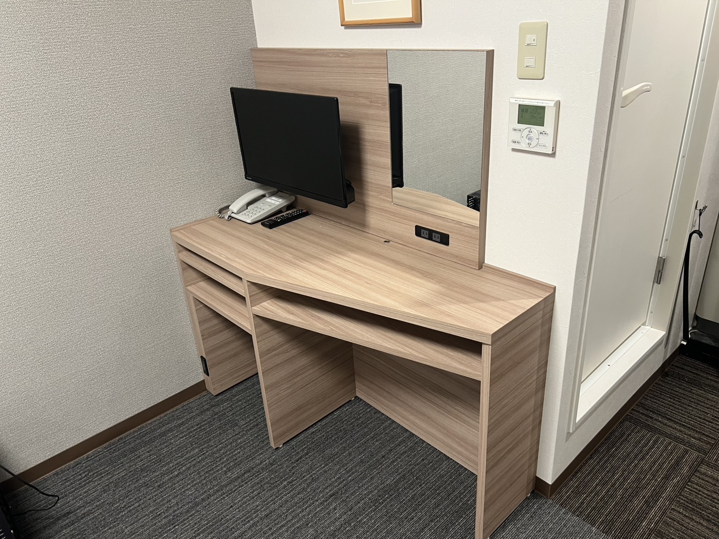 作業机には 壁掛けテレビやミラーを付けまして、下の空間には小型の冷蔵庫と